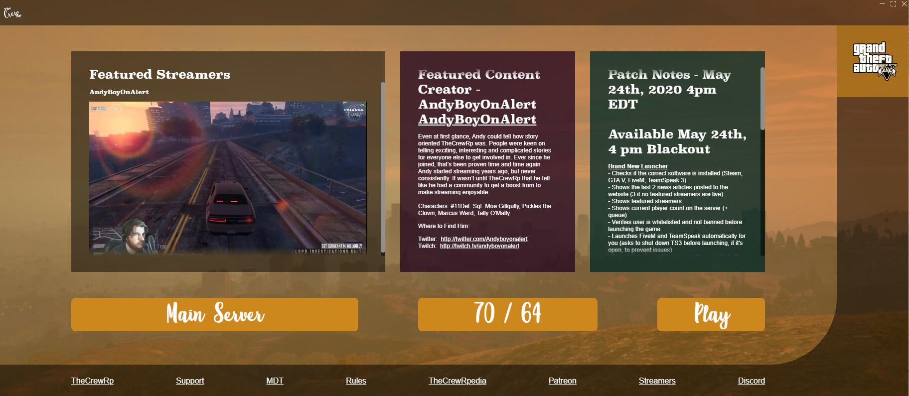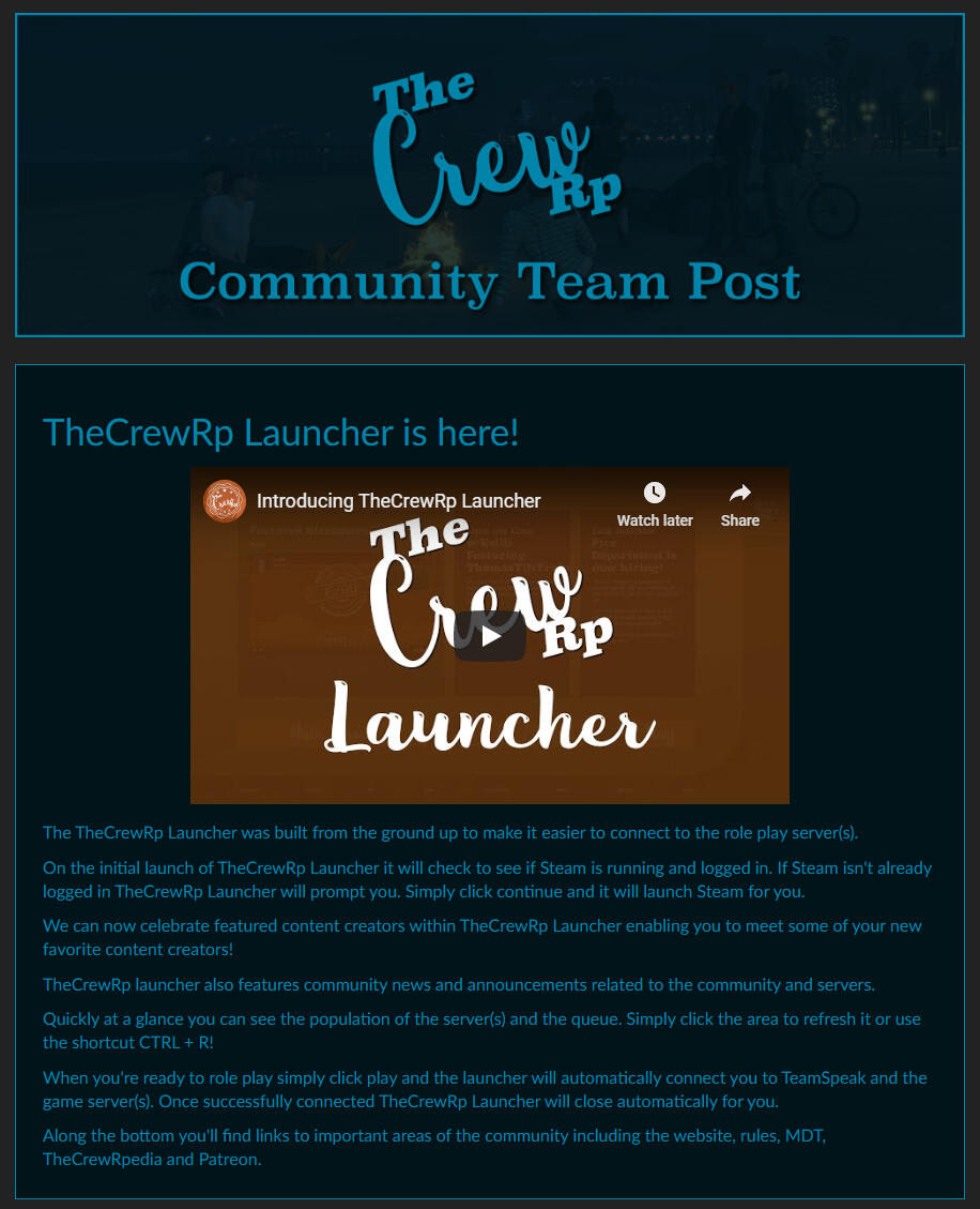 TheCrewRP Launcher centralized onboarding, communication, and community visibility into a single branded experience.Key design goals: